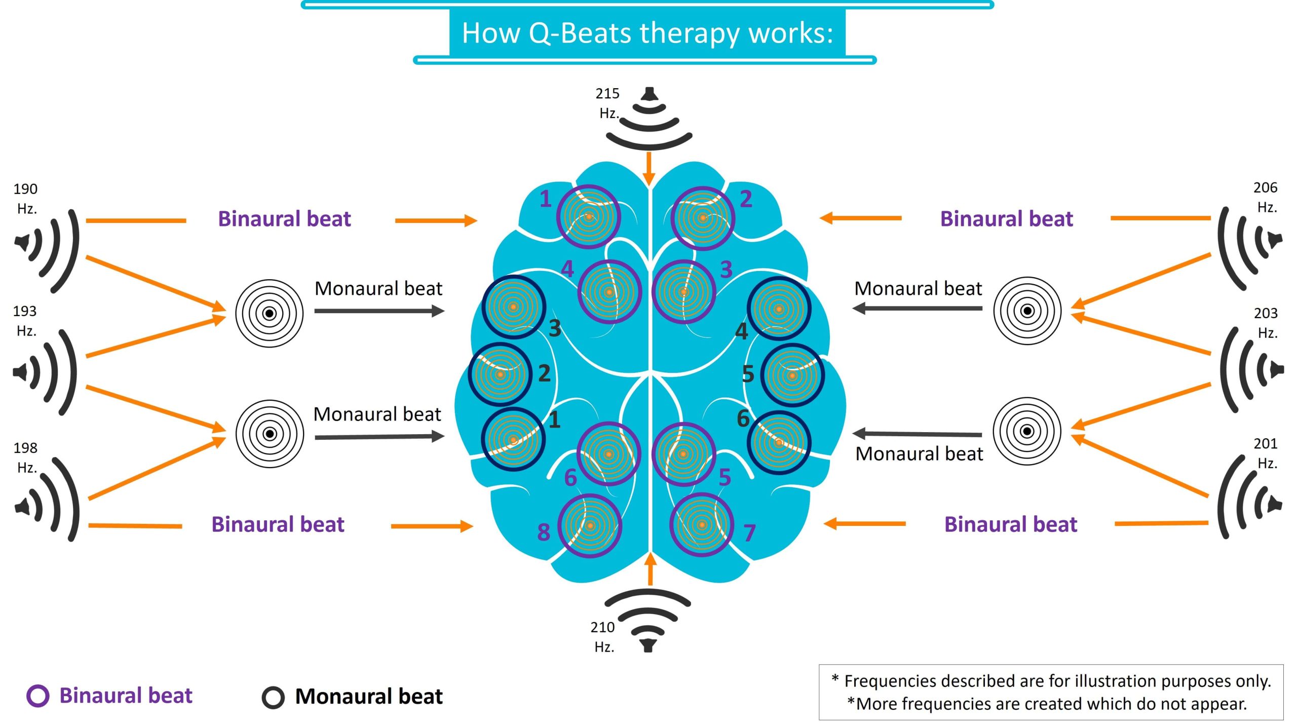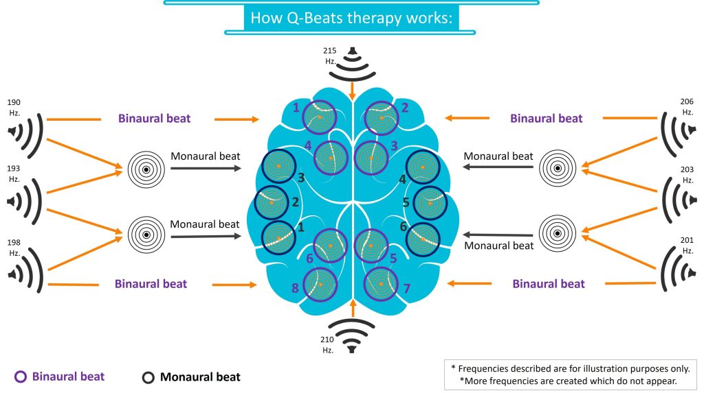 Q-Beats actually combines the two phenomena together. It includes playback of 10 sounds. Between the sounds there are differences that are calculated according to a special formula. The 10 sounds create multiple monaural and binaural beats in the brain.