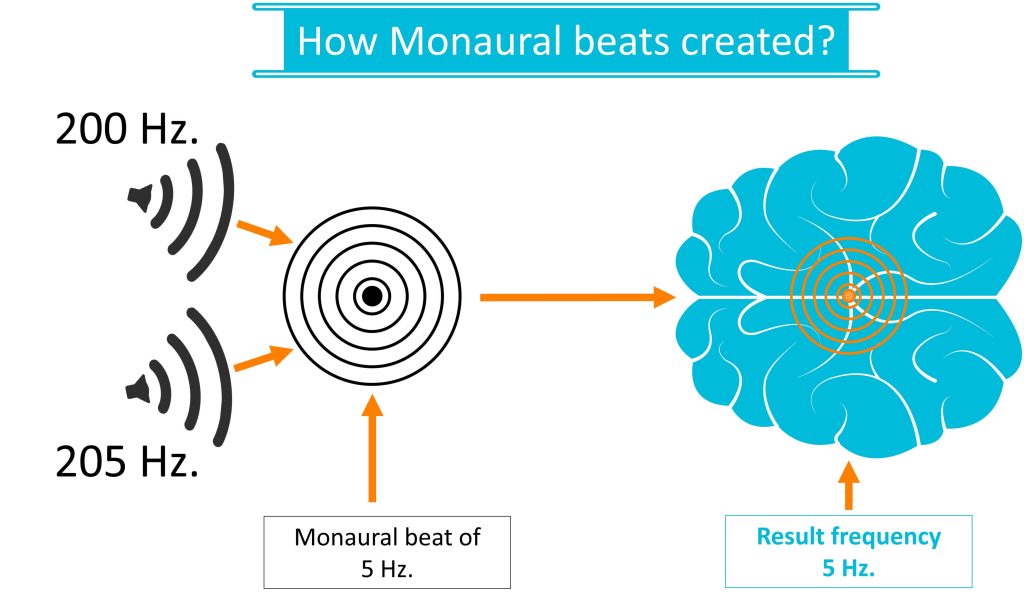 While in binaural beats the wave is created “inside” the brain, in monaural beats the wave is created outside it. In a common process of creating a monaural beat, two sound sources with a small difference between them are used (similar to creating a binaural beat). These two sources (eg speakers) are in the room and they create a third pulse which is the difference between them. This pulse causes the brain to create a wave of a similar frequency in the process of reverberation.